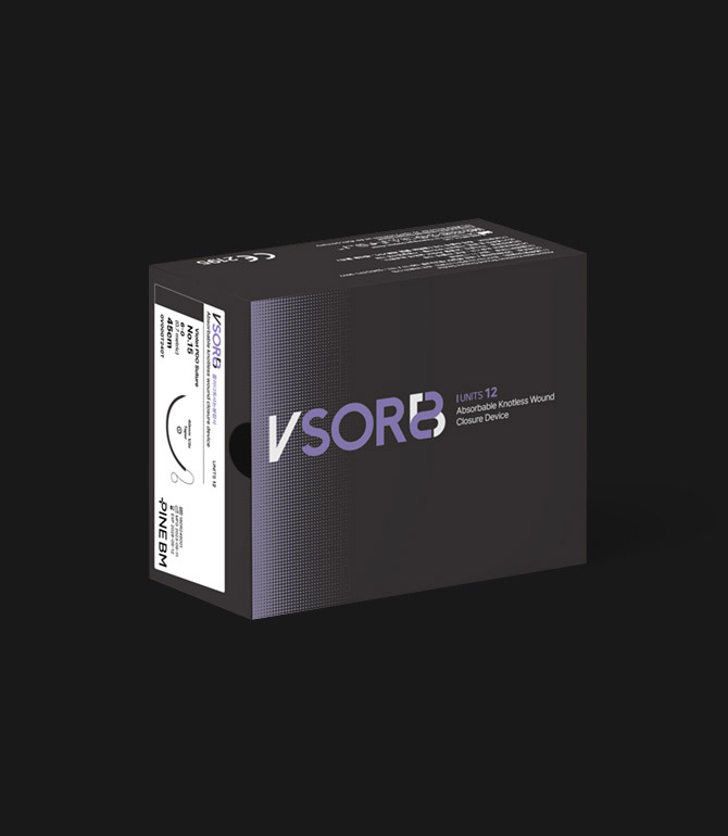 VSORB는 매듭이 필요 없는 PDO 가시봉합사로, 뛰어난 조직 고정률을 제공하여 매듭 없이도 봉합이 가능합니다. 과도하지 않은 피부 절개로 흉터 발생이 줄어들고 강한 봉합 강도가 필요한 경우 사용됩니다. 강한 인장력과 dual angle cut 가시의 강한 고정력은 기존 일반 봉합사보다 더 안전하고 일관된 효율적 솔루션을 제공합니다. 말단 고정 고리가 형태의 엔드 루프형과, 양방향 봉합침 형태의 더블 니들형이 있습니다. USP 사이즈 4-0에서 2까지, 봉합사 길이 14cm에서 72cm까지 다양한 규격을 제공합니다.